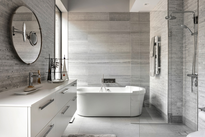 The concrete walls of the Main House and the lower portion of the Pool House were constructed using 4x8-foot panels. Along with the holes created by ties (used to hold the smooth forms in place) the panels create a pattern visible on the facades. The contemporary upper part of the Pool House hints at the naturally aged red and yellow cedar prevalent on the island's vernacular houses, from the historic Victorian houses in the lower village of the Heights, built in the late 1800’s using shingles in beautiful patterns, to the stark Modernist architect-built houses on Ram Island from the early 2000s. Eventually the cedar will turn light gray, adding shimmer in warm hues of gray and complementing the gray of the concrete.