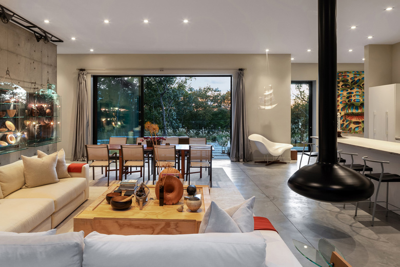 Living space from dining area, with vitrines on the concrete wall (Photo: Evan Joseph)