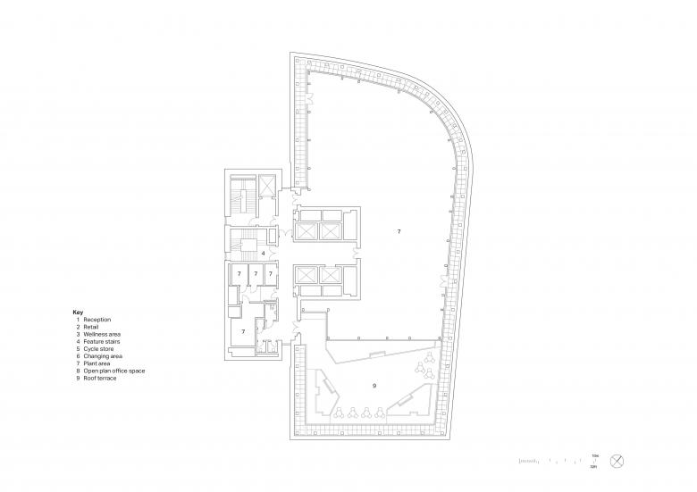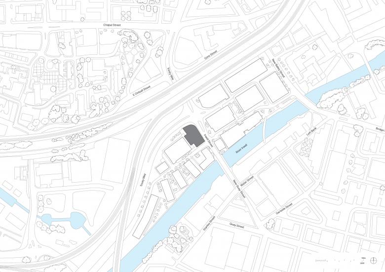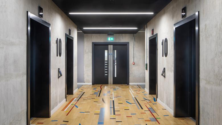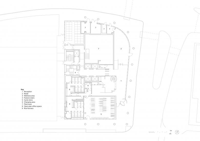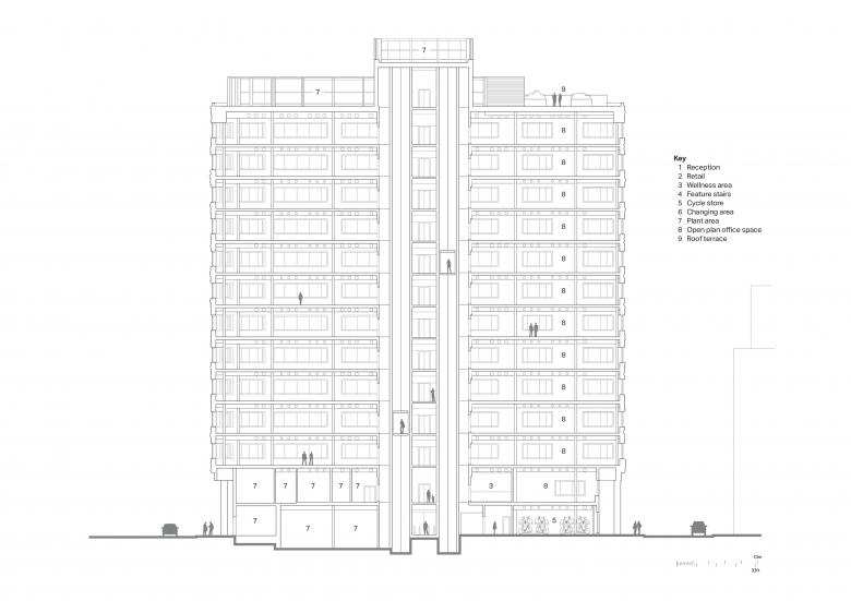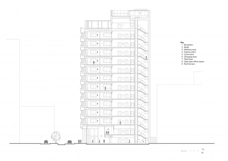Eden was developed on a former derelict surface car park and is bounded by a 10-story NCP car park to the west, plus the busy intersection of Irwell Street and Trinity Way on the northeast corner. The building’s massing was designed to maximize the internal office space over a small building footprint. The extruded side core facilitates large open-plan floor plates from levels 1–11, with uninterrupted internal views, while the rounded northeast corner mirrors the curvature of the Irwell Street gateway, addressing the geometry of this primary route and anchoring Eden as a city marker for this key junction. The ground floor is set back by two meters, creating a pedestrian-friendly colonnade space and reducing the building massing at the public level. The development has triggered important traffic-calming measures for Irwell Street, reducing the carriageways to accommodate better cycling infrastructure and give more prominence to pedestrians.