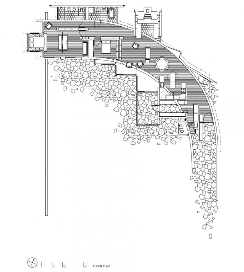This house was designed to take advantage of passive cooling and heating strategies. The long porch roofs allow the Owners to sit outside in the summer while allowing the winter sun to penetrate the living spaces, while the curved red cedar wall protects from the winter winds. Operable windows on the west and south provide natural cooling, while small flipper doors at the head of the cantilevered bed allow the mountain breeze to pass over the bed at night.