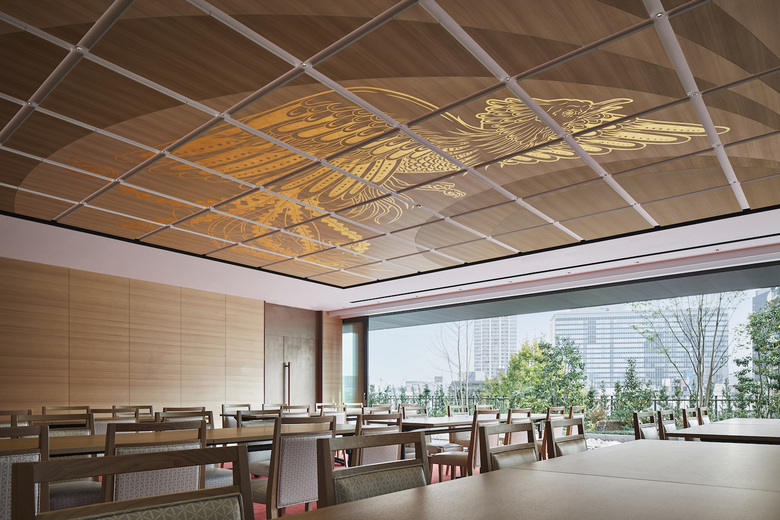 The gold-plated phoenix adorns the ceiling of the multipurpose lounge, placed closest to the sky/heaven on the fourth floor. (Photo: Masato Kawano / Nacása & Partners)