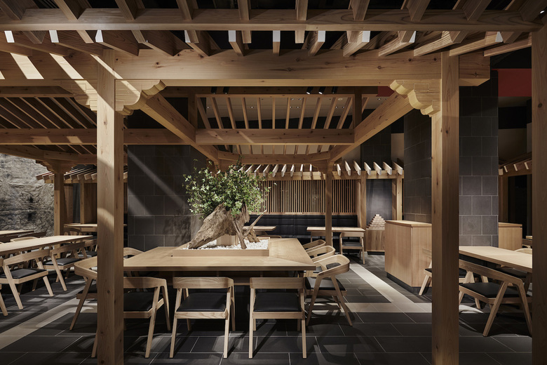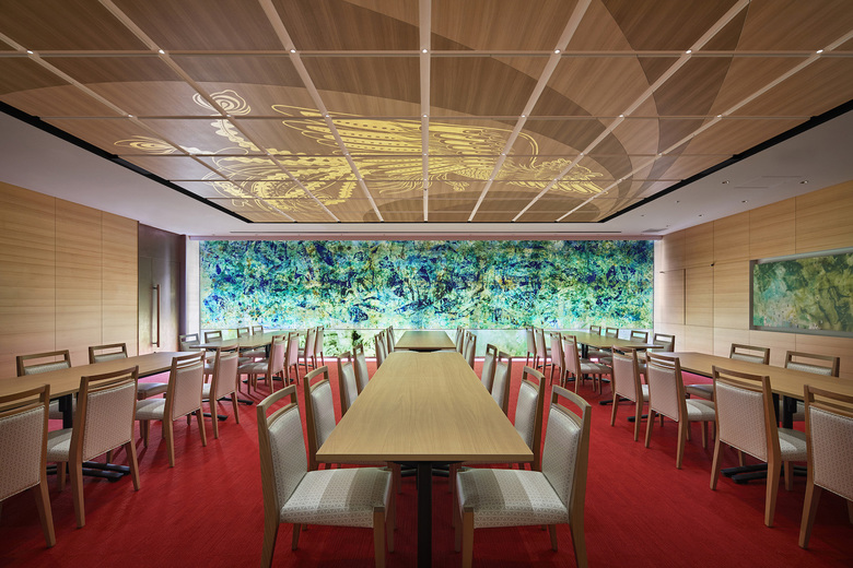 Design Collaborators: GATE interior design office (café), Kiyoshi Kuroda (lounge ceiling), Jotaro Saito (brocade wall hanging), SASUGA (wallpaper)