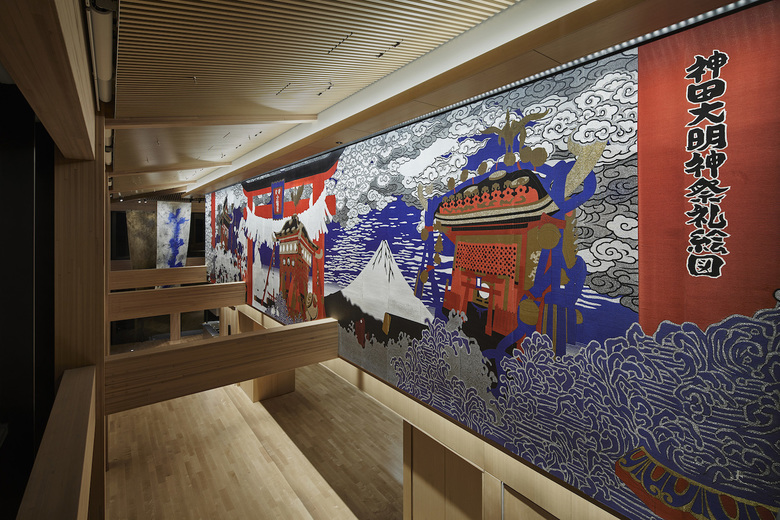 An 18x3-meter Nishijin brocade wall hanging — the largest fabric art of its kind in Japan — depicts the Shrine’s ancient annual festival and its three deities. (Photo: Masato Kawano / Nacása & Partners)