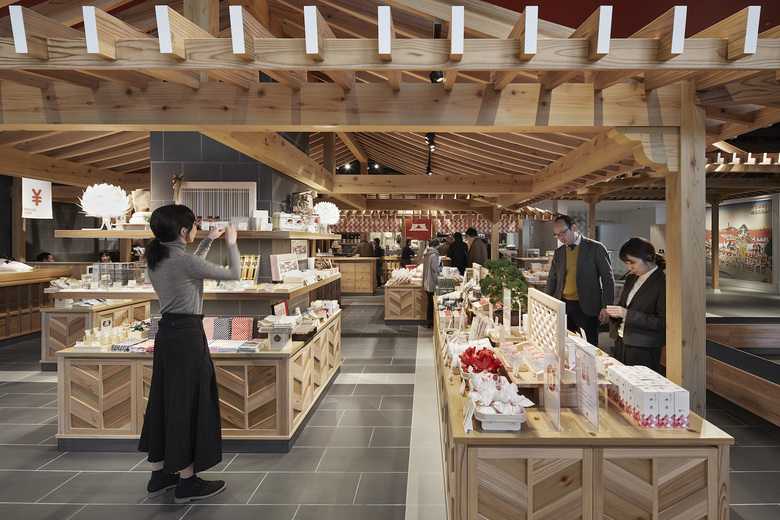 Sustainable, locally sourced wood is used in the souvenir shop on the first floor, providing a natural ambiance and unique aesthetic appeal. (Photo: Masato Kawano / Nacása & Partners)