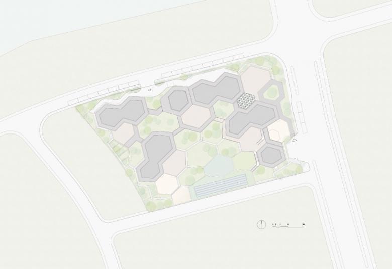 The ideal of the historic Chinese courtyard housing – an impossible dream for most urban residents today – comes through in the kindergarten’s scenic architecture and spatial arrangement around courtyards, traditionally the central space for communication in the family unit and the wider neighbourhood. The tight site houses fifteen-classrooms in two to three storeys on a hexagonal grid plan. The hexagonal shape enables flexible clustering of units according to function, while the combined honeycomb layout achieves maximum use of sunlight. Outdoor space or courts connect directly to the classrooms giving the children opportunities for indoor and outdoor activities. On the ground floor, these outdoor spaces merge to form a continuous and enclosed open space system for the children. Inside the building, zigzag corridors connect the hexagonal units along their courtyard edges, thus offering a rich indoor-outdoor experience. On the first and second floors these outdoor spaces form enclosed courts accessible from a few units.