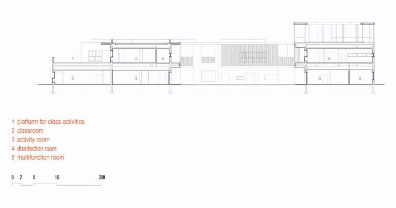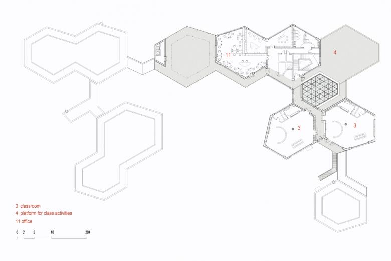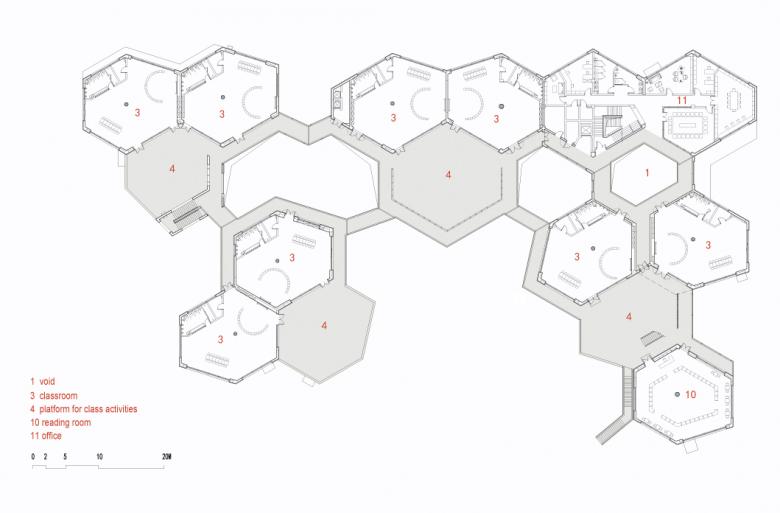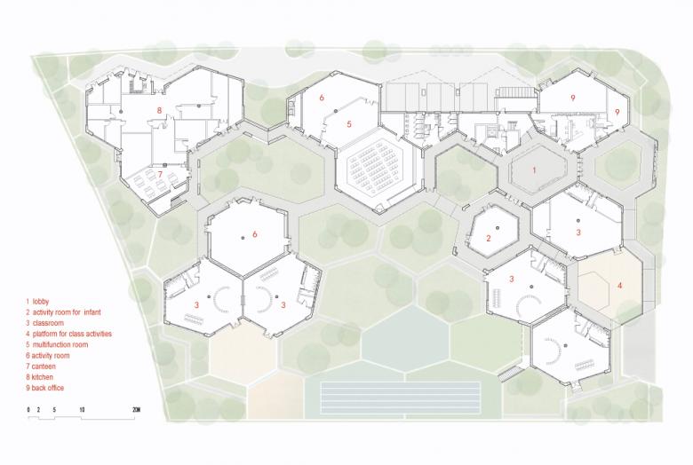 Activities in each unit are organized around the round column in the centre of the hexagonal space. Each two classroom units share a courtyard, and the children are enabled to visit the library, music room and other courtyards by the corridors. Children from the second and third floor use the covered outdoor staircase to join the playground. Overall, the communication within and between the different units and classes allow new experiences for the children and the teachers.