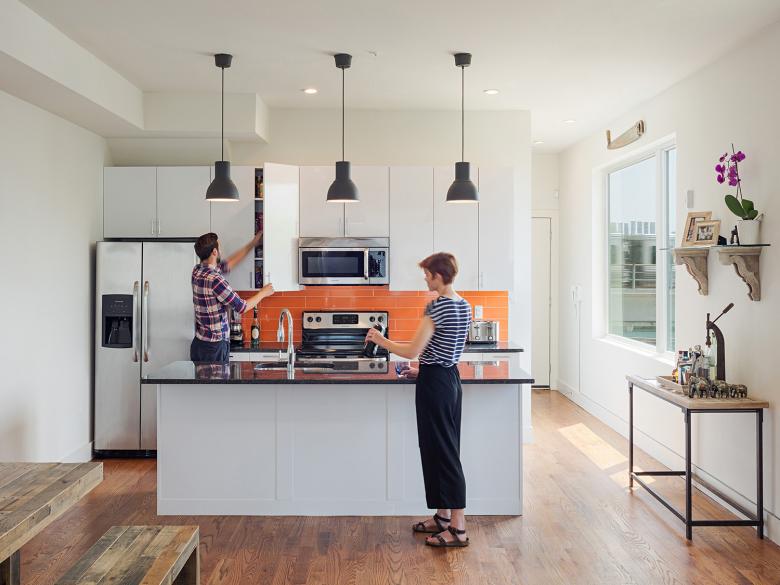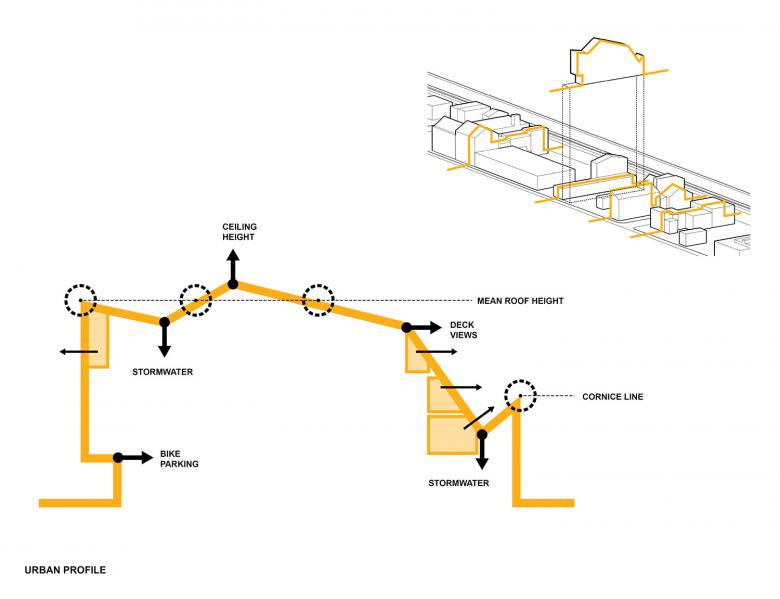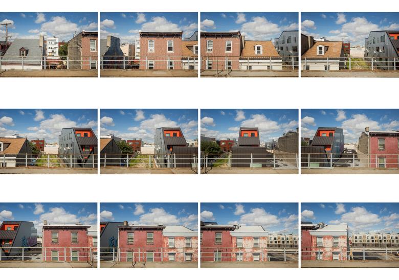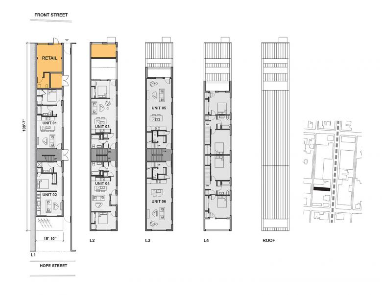 As marginalized urban areas transition into desirable neighborhoods, seemingly problematic contextual elements like adjacent vacant land and elevated railroads can be treated as productive design constraints. The building design was a direct reaction to the owner’s concern about living directly adjacent to the elevated train running along Front Street. The project created a series of setback decks with unusually intimate relationships to the train, turning a liability into a surprisingly novel asset. By further thinning an already narrow site, the building massing unlocked the long south wall as an access point for a central stair as well as south-facing light, air, and views. The blank north-facing facade along the property line was employed as an opportunity for an art piece oriented toward viewers riding south on the train.