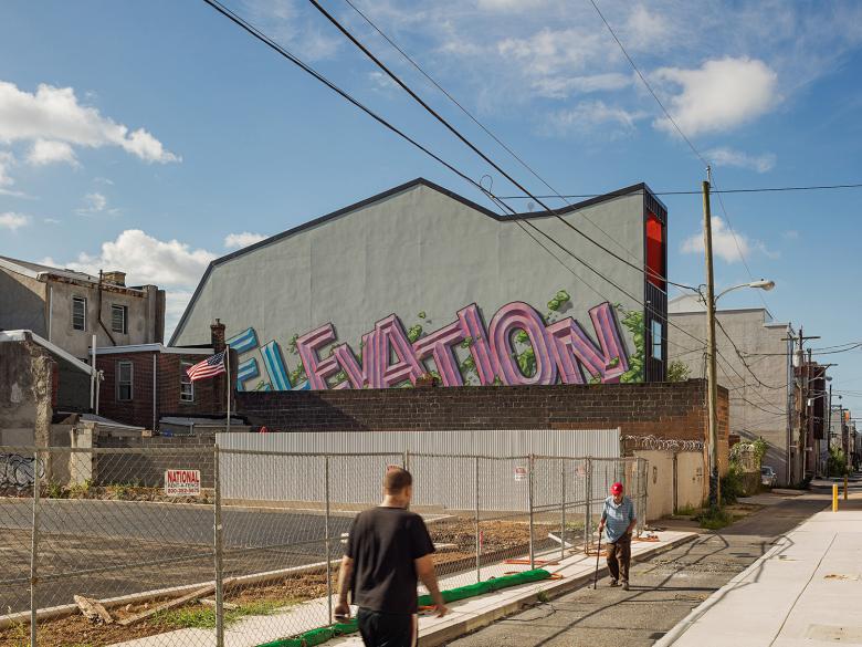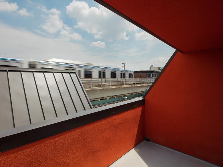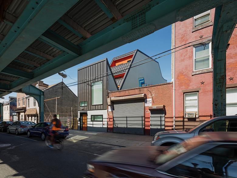 El Chalet is a four-story mixed-use building sited along an elevated train line in the formerly industrial East Kensington neighborhood of Philadelphia. The building shifts program to the long edge of a narrow site along the busy Frankford-Market elevated Blue Line, creating an interior façade facing an adjacent vacant parcel. With a roofline that connects the dots of a quirky zoning envelope, the elevation juxtaposes six units of housing above with a storefront tucked underneath the elevated train line.