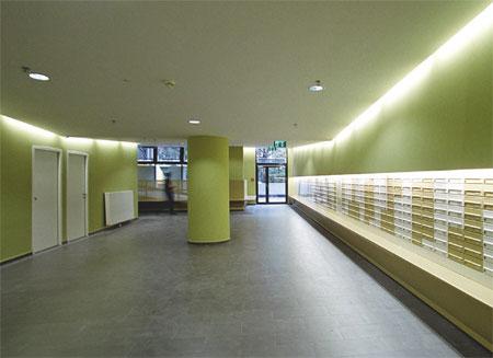 Im Süden ist Martin-Luther-King-Park. An dieser grünen Oase liegt der Hauptzugang, über dem sich die Erker des Sockels zum eternitverkleideten, schräg vorspringenden Bauteil bündeln. Er bildet im Erdgeschoss ein Vordach und schafft so einen halböffentlichen Platz. Ein paar Stufen führen vom Gehsteig in die belebte Passage mit Supermarkt und Lokal. Im Foyer des Wohnturms ebnen gelbgrüne Wände, gelbgrüne Postkästen und eine gelbgrüne Bank den Weg zu den Liften. (...) Isabella Marboe