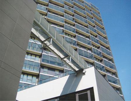 „Als Hochhaus-Profi freute es mich sehr, einmal ein Wohnhochhaus umzusetzen. Dabei geht es im Gegensatz zum Büro, wo vor allem Flächeneffizienz und Flexibilität eine Rolle spielen, mehr um Behaglichkeit, Schallschutz, Sicherheit“, so Architekt Heinz Neumann. „Mich interessierte am meisten, wie es angenommen wird.“ Vor Fertigstellung waren alle Wohnungen vergeben. Die Voraussetzungen für das weithin sichtbare Referenzobjekt – mehr Scheibe als Turm, selbst in der Querachse noch 26 Meter tief – waren denkbar schlecht.