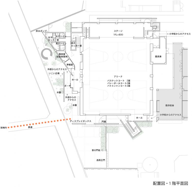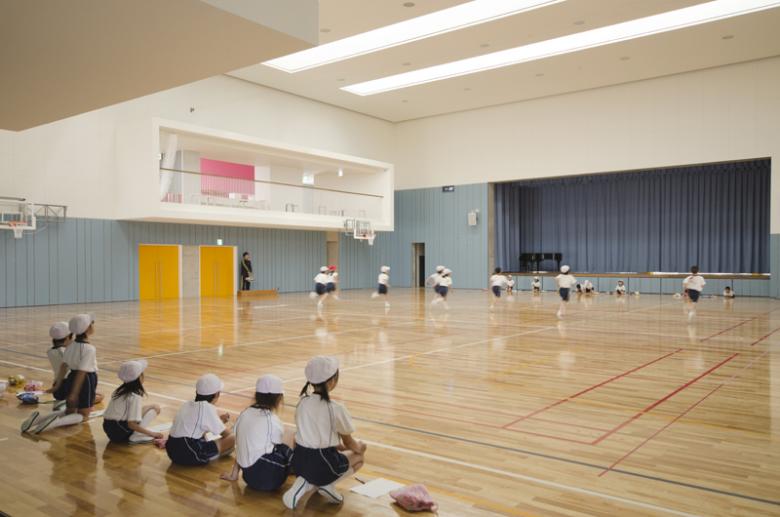 The gymnasium at Ikaruga Elementary School in the town of Taishi was slated to be rebuilt because it was aging and not up to earthquake standards. In addition to its ordinary use by the school, the client requested that the new gym include common rooms that could serve as the location for multigenerational exchanges with the surrounding community, as well as other spaces to serve the neighborhood as a whole. In response, we tried to design a rich space that would serve as a contact point with the community. Motivated by a wish that the children grow up healthy in mind and spirit, we aimed for a place similar to a “sacred grove,” or mori, created out of earth and air. That’s where the name “Taishi no Mori” [Taishi Grove] came from.