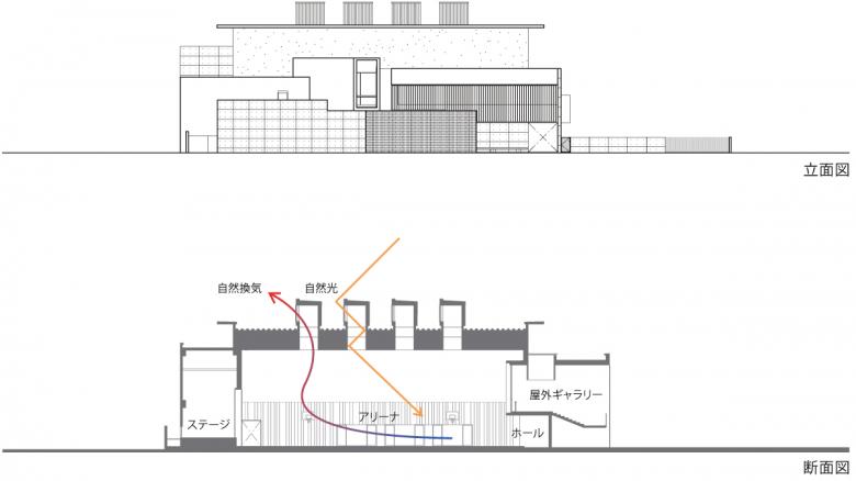 There were no differences [between the plan and the final structure]. However, because a gymnasium is a very particular type of structure, there were a number of ways in which we needed to innovate. First, in order to realize a comfortable environment for indoor sports, we included north-facing clerestory windows in the interior arena. That eliminated the need to artificial lighting during the day and supplied a stable natural light source. Next, by allowing the windows to be opened and closed at will, we ensured efficient natural ventilation that takes advantage of the change in elevation between different parts of the building.