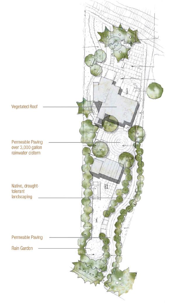 Much of the existing site was covered in turf and impervious paving. The site was rehabilitated with native and drought tolerant vegetation and pervious pavers. The crest of the bluff was restored with plantings to reestablish habitat and to prevent erosion. Extreme care was taken to preserve natural habitat and existing trees throughout the construction process. A large rain-garden is integrated into the west side of the site, providing an on-site eco-system and habitat as well as collecting and filtering storm water runoff.