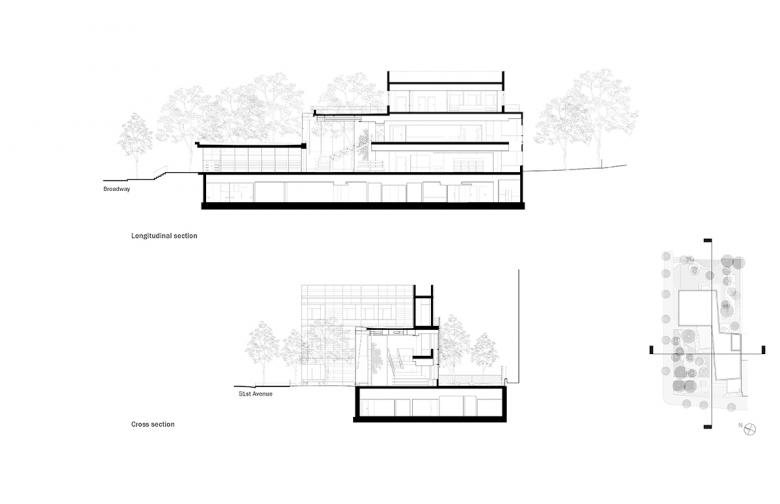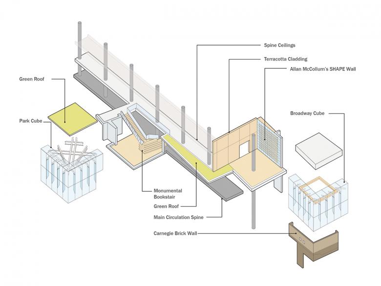 The Cubes’ radical transparency works from outside to inside, maximizing their visibility as desirable destinations, and from inside to outside, situating library patrons simultaneously within building and city/landscape. The Cubes, which glow as luminous beacons after dark, are calibrated to relate to the scale of existing historical fabric, including the 1776 St James Parish Hall across Broadway. The Park Cube provides passersby a view into the library’s two main floors and the special stair that connects them. The Broadway Cube, floating above the Main Entry, announces the library’s presence from afar.