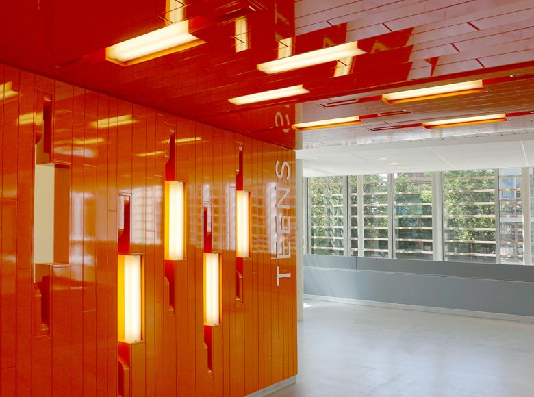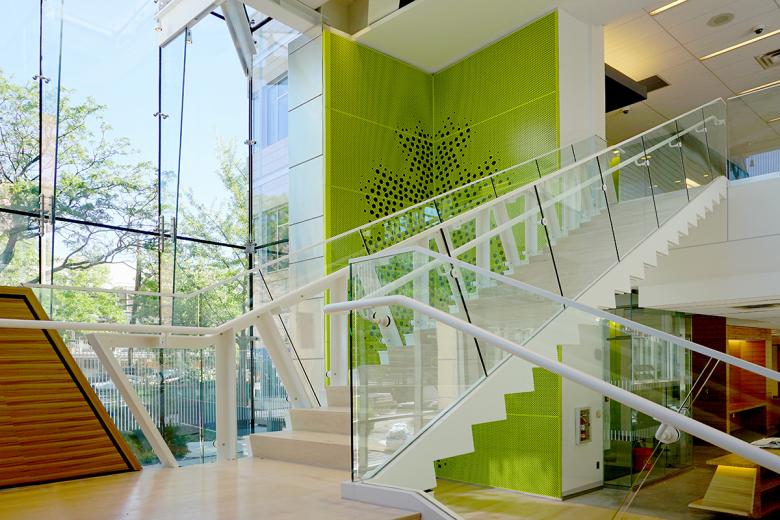 Our involvement with Active Design initiative informed integration of horizontal and vertical circulation systems, including installation of Allan McCollum’s artwork in stairs and elevators, and creating oversized landings with corner windows at the main stair, overlooking the Community Park.