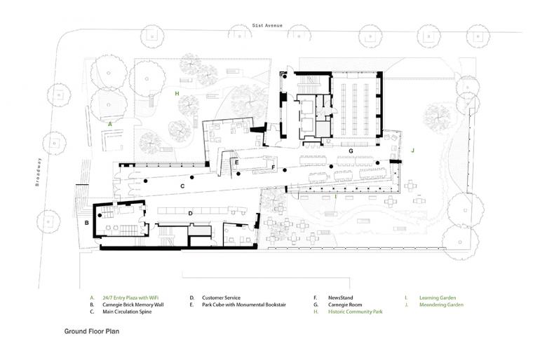 The library’s design maximizes accessibility to a wide range of programs, integrating the performance of architecture and landscape to establish relationships between inside and outside. The Broadway Cube, visible from afar, provides the new library with a presence on Broadway. The "Spine," with its Sparkle Grain concrete paving, extends from the entry plaza along the length of the building, bringing the city into the interior.