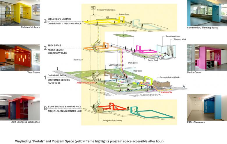 The library’s program spaces cater to its diverse constituences. A system of colorful portals contributes to identity, supports orientation, and stimulates interaction among diverse users.
