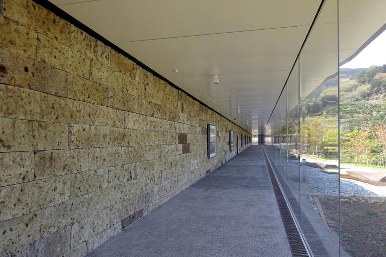 The main gallery in Enoura is a long hallway with art on one side (attached to a volcanic rock wall) and long vistas on all three other sides. It is 100 meters long and sits 100 meters above the sea level. The art gallery juts out from the hillside and cantilevers dramatically at its rear end to provide even more exciting views across the Pacific Ocean.