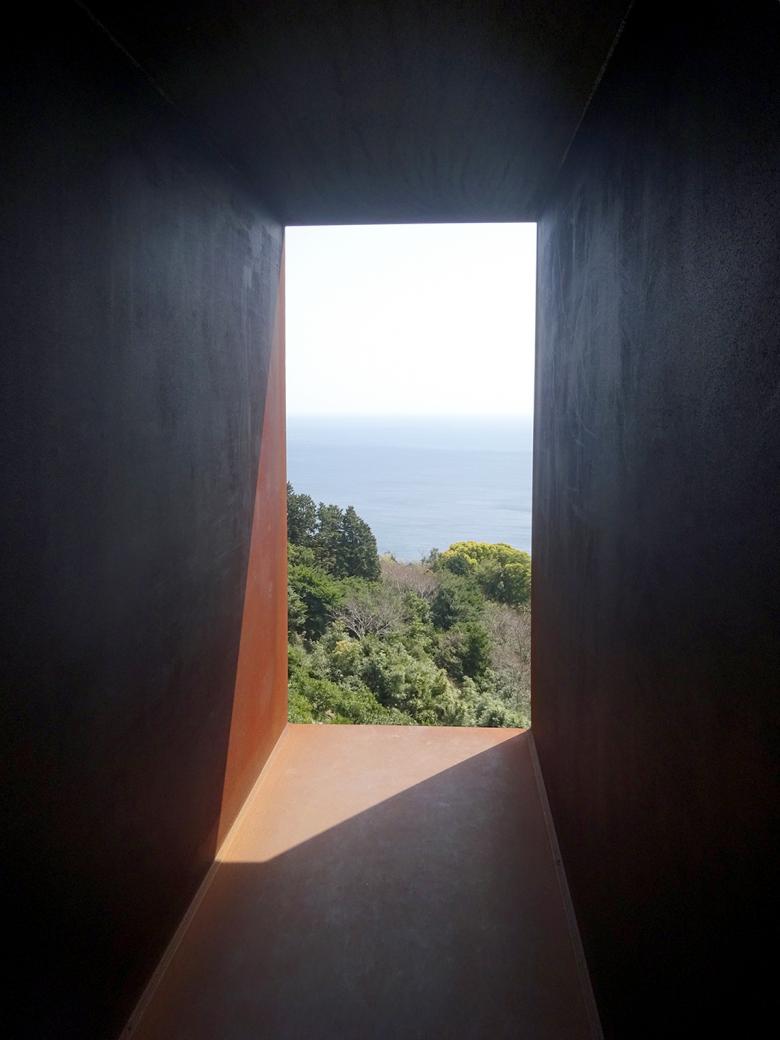 The most unique feature is 70-meter long boxy "tunnel" that crosses beneath the gallery at a steep angle, forms an X, and sends daylight from the seaside cliffs to a group of stones in the valley. The rectangular, underground chamber is open at both ends and oriented to frame the sun — the horizon where sky and ocean meet. The rectangular boxes of rust-red Cor-ten steel were welded together on-site, creating a long tube whose apertures frame the scenery around the secluded bluff. It starts underground and exits at a drop, becoming a beam to walk upon. Next to it, a glowing glass stage for Noh performances seems to float on its Kakezukuri wood-frame construction. The cypress scaffolding is joined in the traditional Japanese carpentry style without any nails, screws or glue.