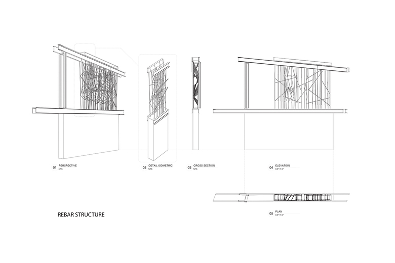 The rebar was originally chosen because the ribs in its structure were similar to the ripples in the surface of the water in the pond. The choice to expose and compose the rebar arose from the desire to mimic the play of light and shadow that exists within the forest that surrounded the site. It also linked the house to the spindly forest edge that was exposed when the pond was cut into the site.