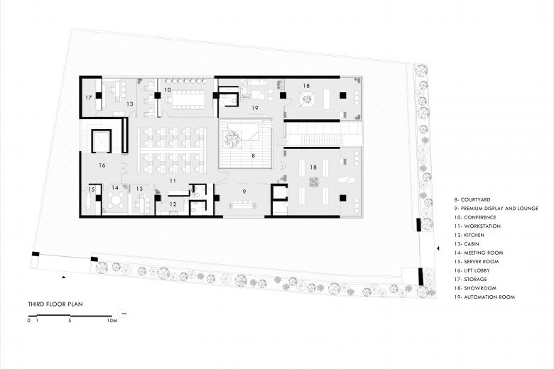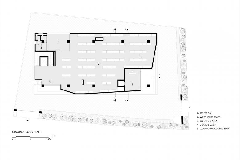 The client’s adherence to Vaastu Shastra significantly shaped the building’s form and layout, eliminating cantilevers and establishing a closed-cuboid approach with a mandatory courtyard at the heart of the program. Functional requirements, a warehouse, workspaces, and an experience center determined the vertical stacking of activities across five levels. The inclusion of an open-sky courtyard provides workers with a pause space, reflecting an understanding of daily user needs. Storage functions placed above help create a thermal buffer, improving comfort for occupants. These inputs collectively guided spatial organization, functional clarity, and climatic performance within the building.