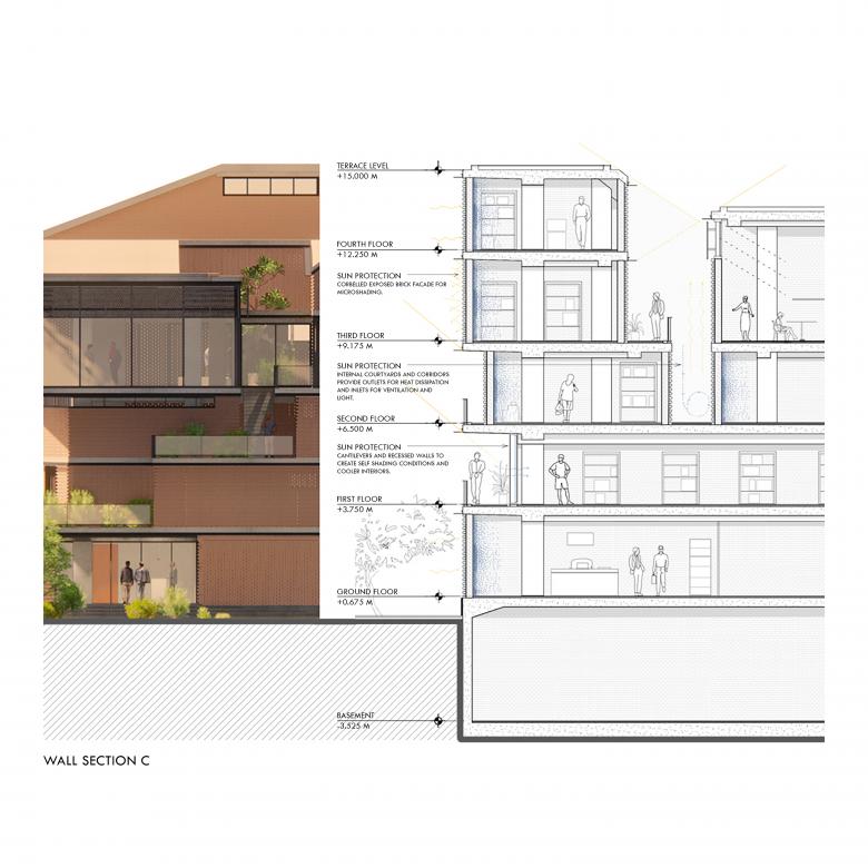 Facets reflects our core philosophy of integrating functional demands with cultural principles and climate-responsive design. Like other projects by the practice, it prioritizes contextual sensitivity, using massing, materials, and passive strategies to derive performance from form. The combination of rigorous structural logic, a minimal grid of ten columns with post-tensioned slabs, and expressive sculptural articulation aligns with the studio’s approach to transforming constraints into opportunities. The use of local craftsmanship, especially terracotta brickwork, and the focus on human-centred spaces such as the courtyard demonstrate the firm’s consistent commitment to culturally rooted, climate-attuned architecture.