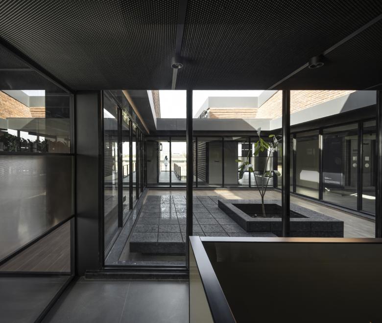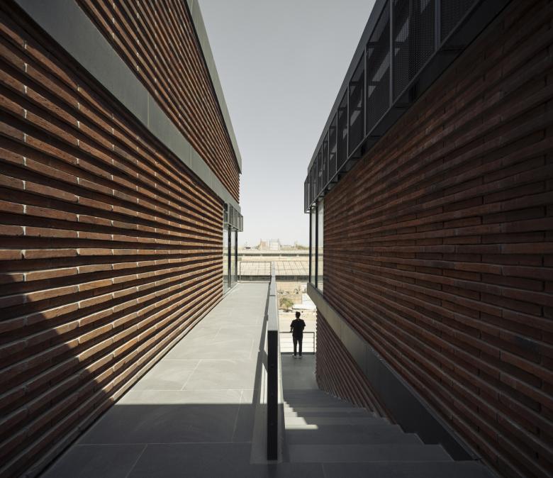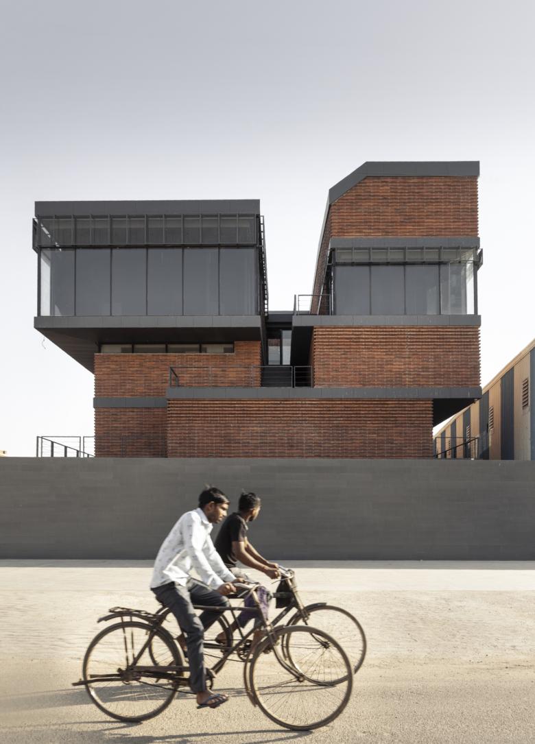 The design draws inspiration from Jodhpur’s climate, regional material traditions, and the cultural framework of Vaastu Shastra. Climatic challenges, intense sun, heat, and dust, shaped the massing into offset, shaded volumes that create terraces, reduce heat gain, and encourage passive cooling. The Vaastu-mandated courtyard and closed-cuboid logic informed the spatial organization and volumetric discipline. At the same time, locally sourced terracotta bricks and linear horizontal coursing link the building to Jodhpur’s craft heritage. Together, these influences merge functional industrial requirements with cultural and climatic responsiveness, forming a building that is both performative and rooted in place.