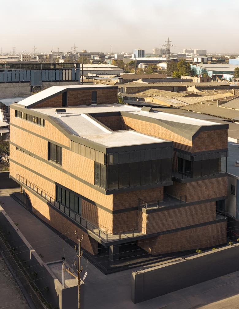 Facets is unique because it transforms a conventional industrial typology—standard PEB warehouses—into an expressive architectural statement. Instead of presenting a monolithic mass, the building uses staggered, interlocking volumes that break down scale, create movement, and offer climatically responsive shaded pockets. Its design is shaped by strict bylaws, Vaastu Shastra guidelines, and sculptural mass subtraction, resulting in a closed-cuboid form that remains dynamic. The entire structure rests on only ten RCC columns with post-tensioned slabs, enabling free planning and sculptural freedom at the facade. Local terracotta brick cladding grounds the bold contemporary form in regional craft traditions.