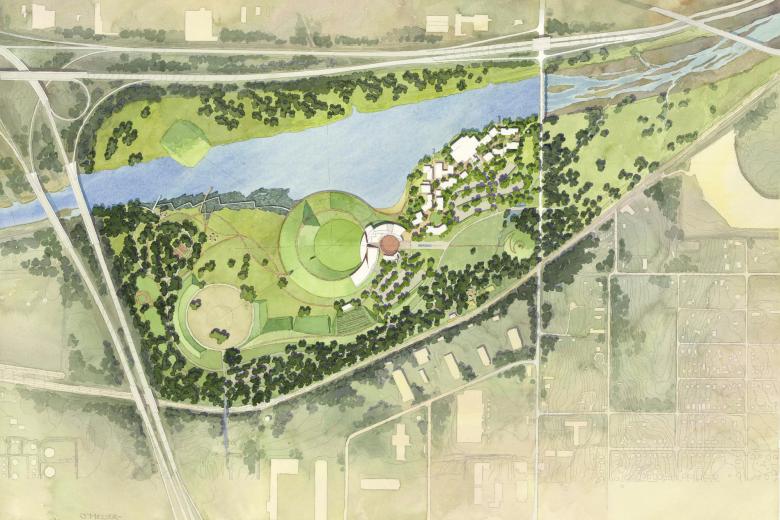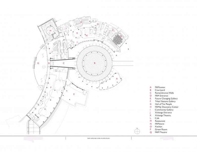 During the site selection process, some of the elders suggested an earthen mound as the basis for the site plan. Historically, mound building was used by many tribes in the Americas to elevate the earth above dangerous flood levels. Fortuitously, several local construction projects needed to deposit 400,000 cubic yards of red earth fill — 45,000 truckloads. Given to the museum at no cost, the gift created the 1,000-square-foot diameter spiral FAM Mound rising to 90 feet at its peak that became the central element of the master plan.
