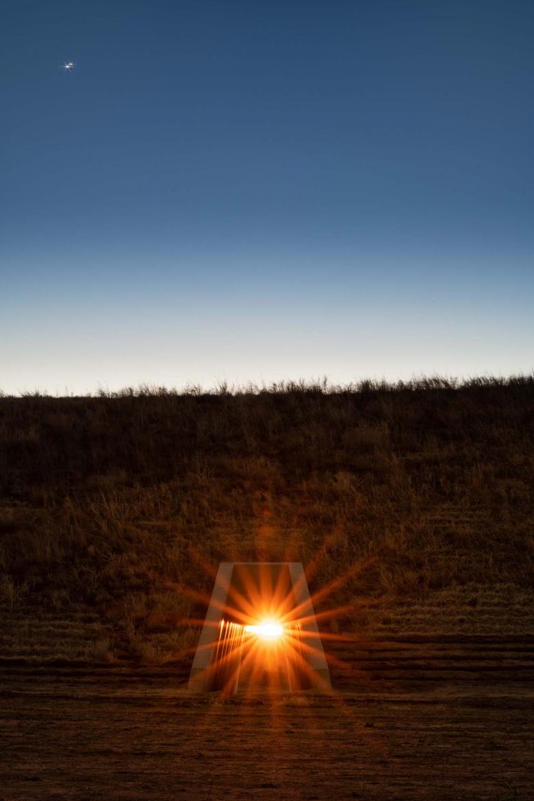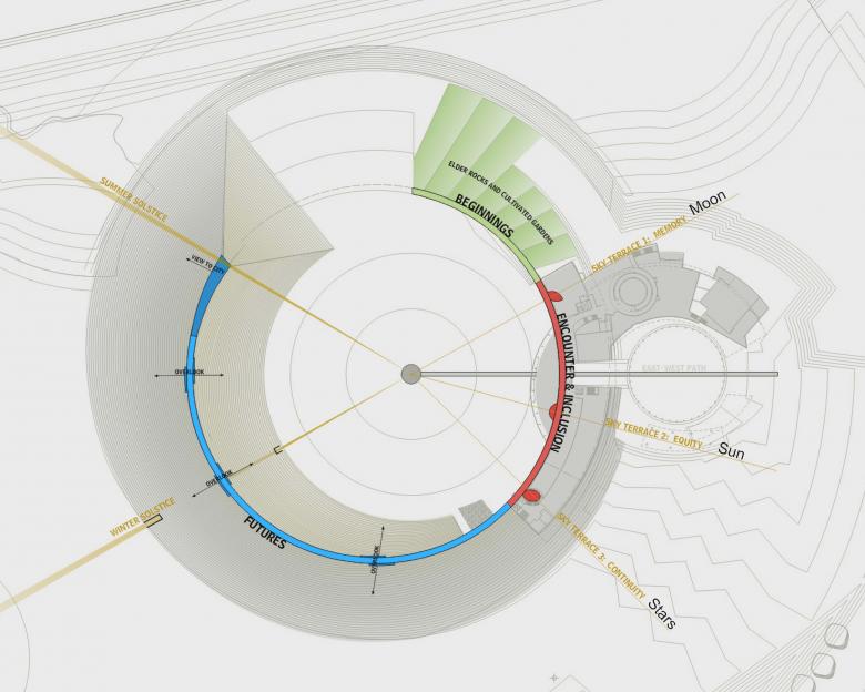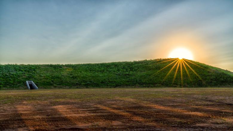 For thousands of years, native people have recognized the importance of the solstice. The entire project was designed to align with the cardinal directions and serve as a cosmological clock, commemorating and honoring the special times of equinox and solstice. The east-facing museum entrance framed by the stone walls aligns with the sunrise of the Vernal (March) and Autumnal (September) Equinoxes, with the sun rising directly in the center between the walls. During the Winter Solstice, the sun sets through the tunnel embedded into the FAM Mound; during the Summer Solstice, the sun sets at the peak of the mound.