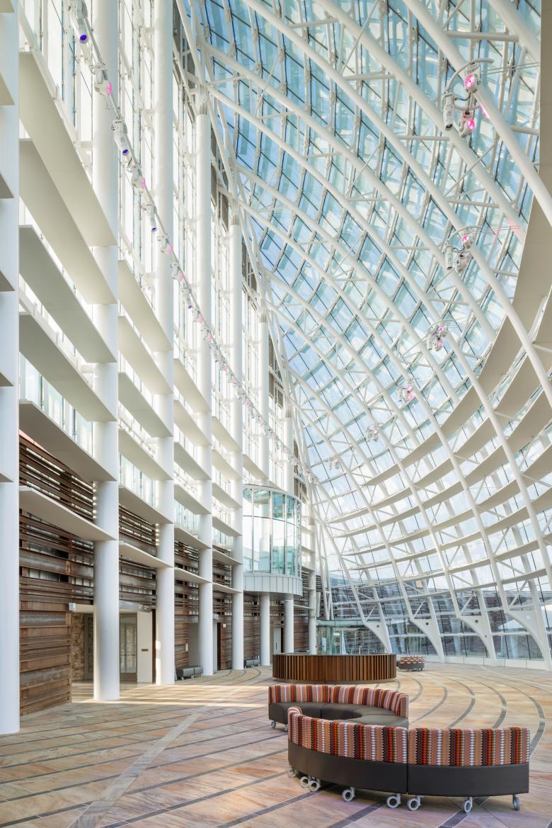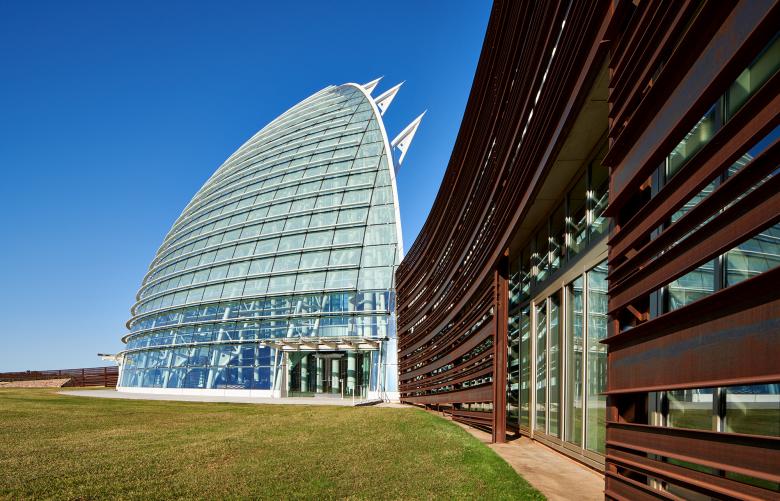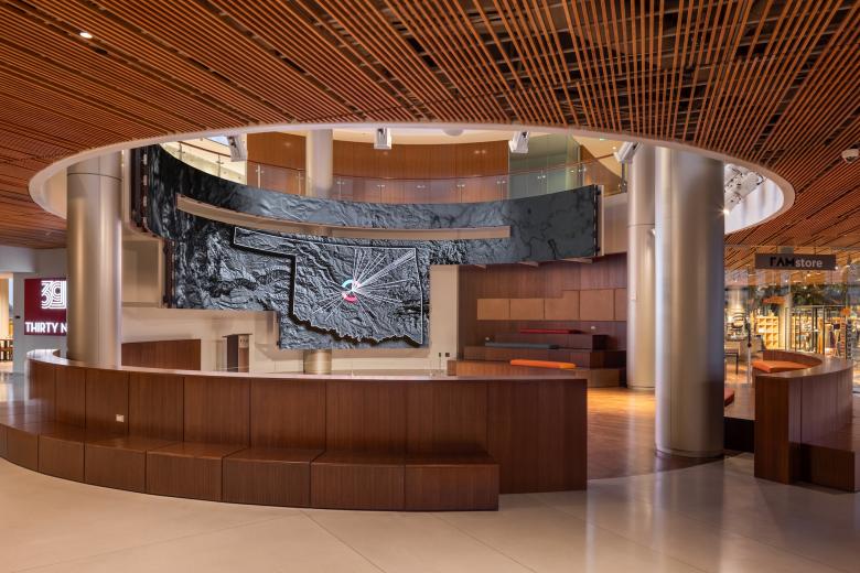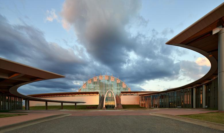 The concept for the museum, which honors 39 tribes in Oklahoma today, is a spiral mound in the form of a circle that begins in the earth and ascends to the heavens. That circle is intersected by a second circle forming the Hall of The People. The second circle is composed of two arcs: the western arc features permanent and rotating exhibitions, and the northern arc houses theaters, retail, dining, and other services necessary in modern museums. The Hall of The People is a 110-foot-tall glass prismatic structure that serves as both a starting point for visitors and a central gathering space. Its form is inspired by a Wichita grass lodge, and it features ten 26-inch-diameter columns to represent the ten miles per day that native people were forced to walk during the expulsion from their lands. Three “sky terraces” (Sun, Moon, Stars) are located along the spiral mound walk and are set back within the building envelope, offering views of the Oklahoma River and Downtown Oklahoma City.