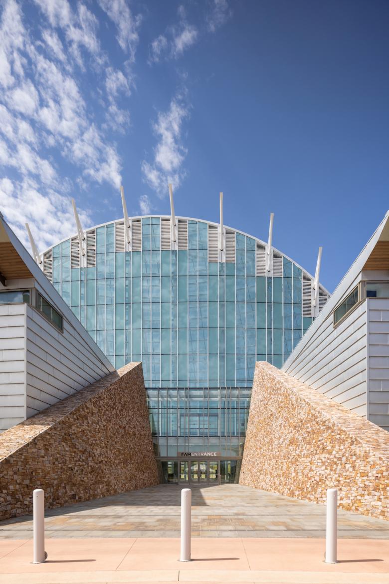 The entrance to Hall of The People is framed by Remembrance Walls of Mesquabuck stone quarried from southeast Oklahoma. Mesquabuck stone is especially significant, as it carries the name of the Potawatomi Chief Mes’k wah-buk. Mes’k wah-buk refers to the red color of the sky at sunrise and sunset — the stone itself is characterized by its visible red and white strata. These two walls, which are 40 feet high, line a 113-foot-long walkway at the entrance of the building to honor the indigenous people who were forcibly removed from their tribal homelands as a result of the 1830 Indian Removal Act.