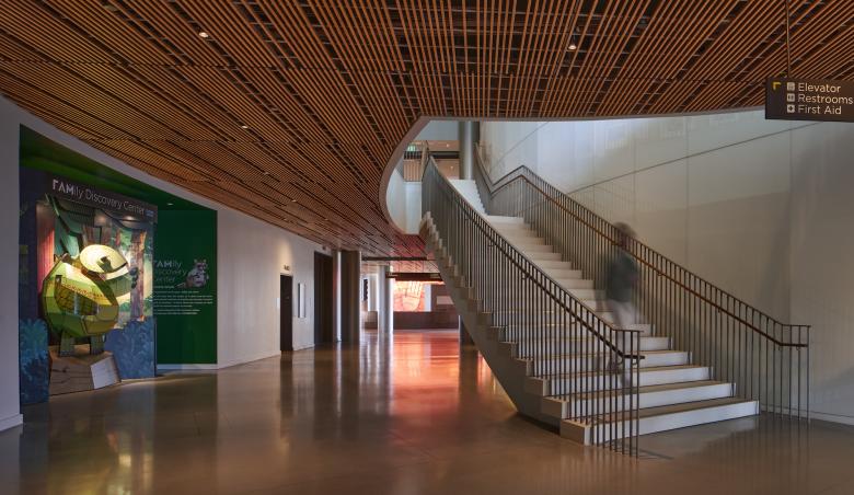 The entry procession starts from the east to greet the rising sun. A stainless-steel sculpture called “Touch to Above” (by father and son Cherokee artists, Demos Glass and Bill Glass, Jr.) welcomes visitors upon arrival into the courtyard. Flanking the entrance to the left side is the FAM Center, which features educational activities, and on the opposite side of the entry courtyard wraps the museum’s northern wing.
