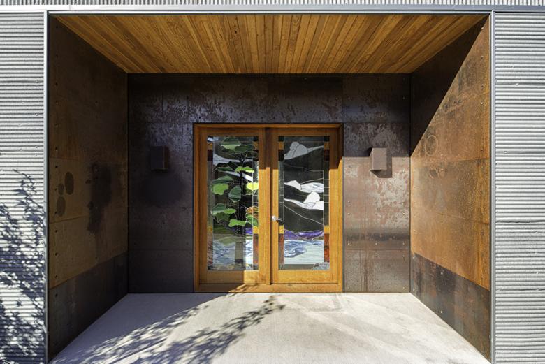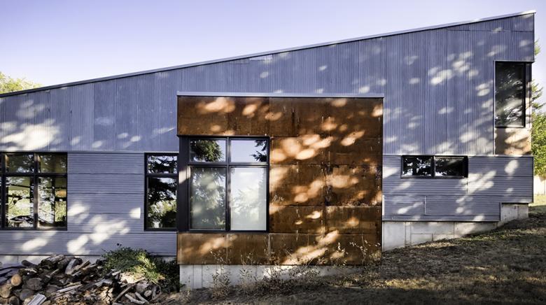 In the more practical, contractor end of things, they were very interested in using reclaimed materials, in being thoughtful about resources. They had the idea of using salvaged materials, such as the metal siding that was salvaged from a historic barn near the site. While the form is hardly traditional, the use of materials ties the building back to the area's vernacular history. Came with idea of salvaged materials, such as metal sideing was slavaged from historic barn near site. Form is not traditional but tied back to vernacular history through use of materials.