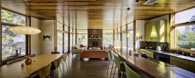 The living areas in the cabin face the water. On the main level the living room is enclosed only by large sliding glass doors and the fireplace. The cabin feels like an open air pavilion when the doors are wide open. An elevated concrete patio surrounds the living room on three sides and allows a variety of shaded or sunny experiences, each with a spectacular view. Outdoor dining is fantastic on the east side of the house with views to the mountains and the lake but protected from the late afternoon sun. The indoor and outdoor fireplaces recall beachside campfires and allow the family to gather comfortably around the hearth in any weather while watching the lake. Stairs connect the main level patio to grade.