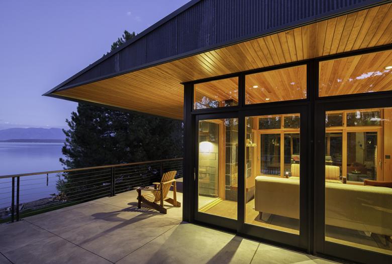 The Flathead Lake Cabin is a year-round cabin on the shore at the south end of Flathead Lake. It was designed for a couple in their forties and their four school-age sons. The cabin has terrific views to the north, up the 25 mile length of the lake, and east, to the Mission Mountains.