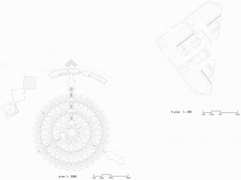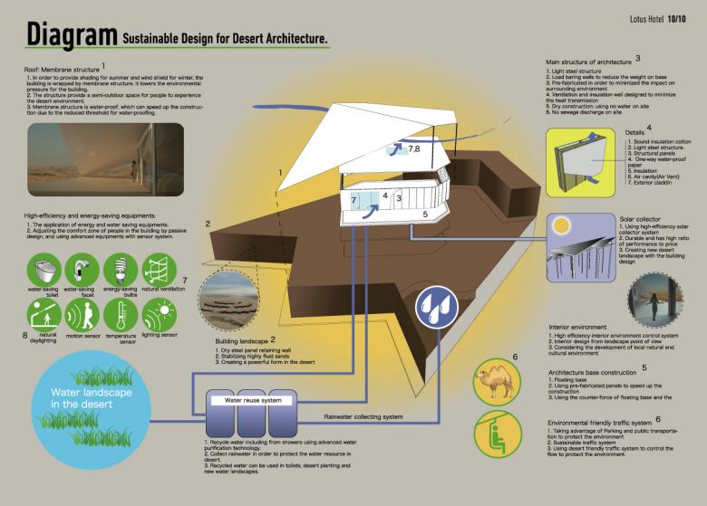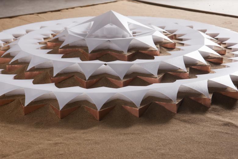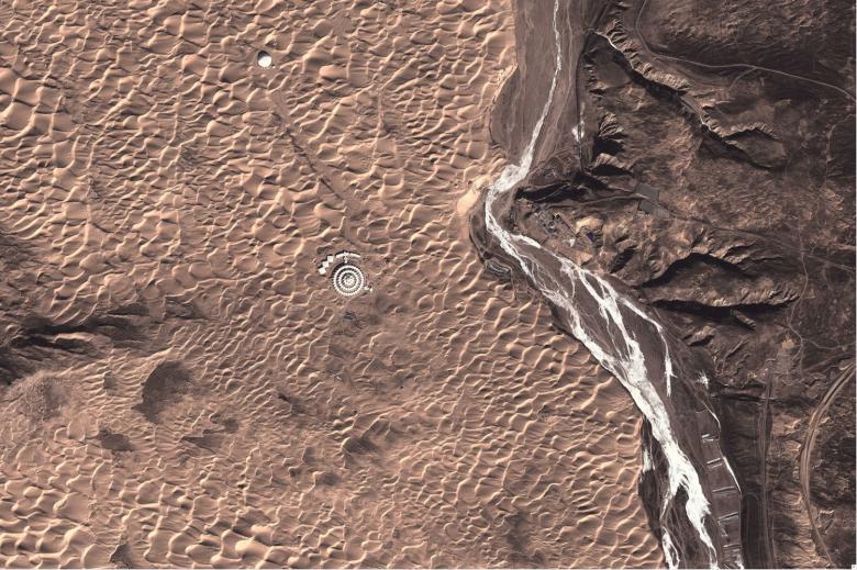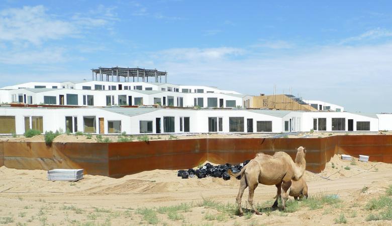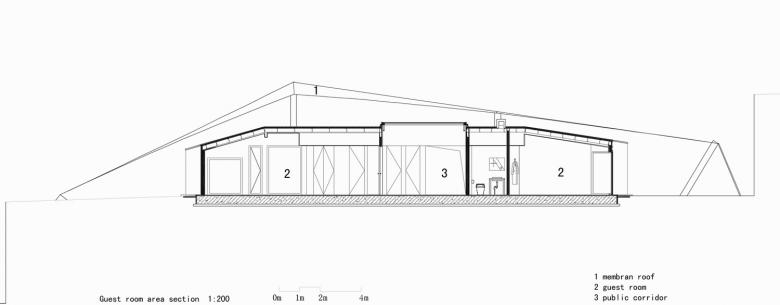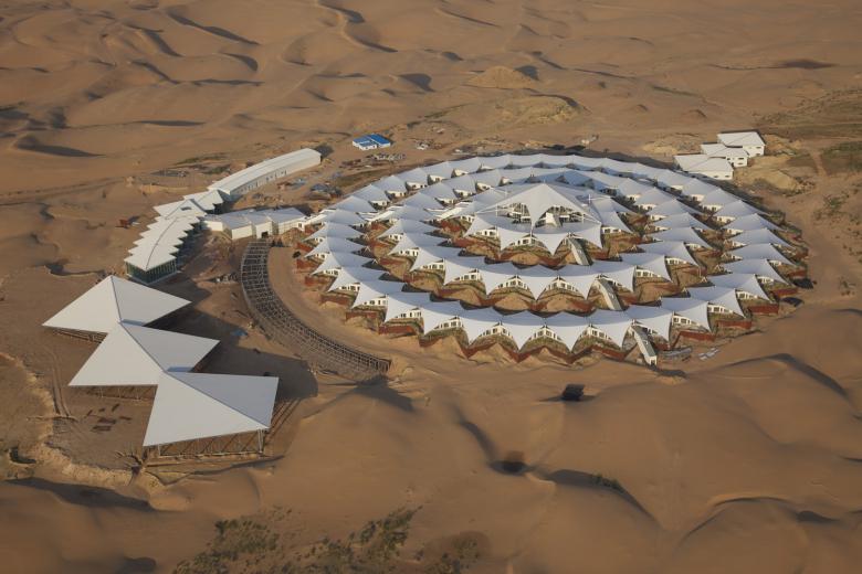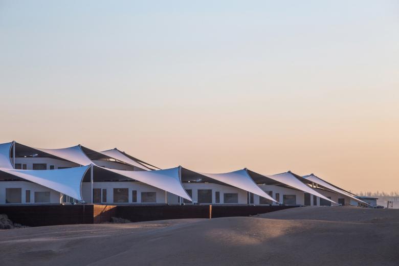 From 2009 onwards the team of architects and engineers investigated minimal interventions that would preserve the sensitive environment. The conclusion was to stabilise the moving sand by using zigzag steel panels in four circles, each with a five-metre height difference. The steel panels retain the highly fluid sand and stabilise three stepped platforms. The one-storey prefabricated lightweight construction for the hotel rooms are placed on top of each platform. The regular form is further enhanced by the geometric membrane structure that covers the building and which is used to collect rainwater and shade the rooms.