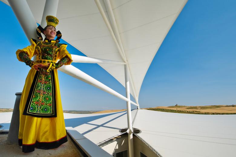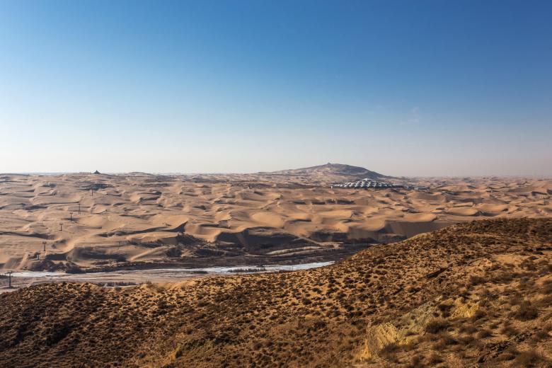 The architects reacted sensitively to the delicate environmental issues. The entertaining access by cable car or camel and the search for resilient techniques for supply and waste management found a form that sits harmoniously among the moving sand dunes of an extraordinary place. From afar the hotel looks as if it is a multi-storied structure that echoes the ovoo-shrines in the landscape.