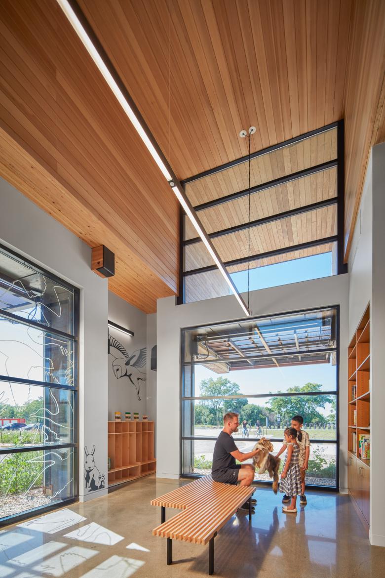 Upon entry, visitors are introduced to the Calumet Region and the story of Big Marsh Park through the exhibit. Steel frames display information on wood and acrylic panels next to encased taxidermy and custom wall murals. Recognizing that the building would be used for a wide range of events and activities, the interiors were designed with flexibility in mind. All of the displays are set on casters so that they can be easily wheeled to a storage room. On the opposite side, the classrooms have a retractable wall to divide or open the space.