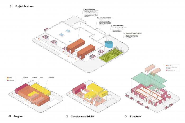 The building's materials reinforce its mission: weathered steel cladding (Dri Design) recalls the site's industrial past, in contrast to exposed Nail Laminated Timber (reSAWN TIMBER co.), alluding to an environmentally-responsive future.