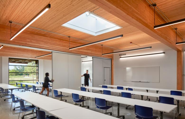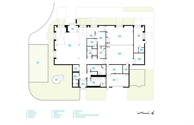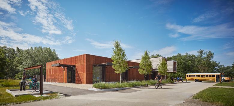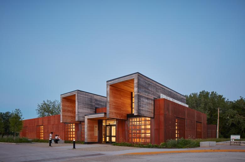 Sustainable features like the wastewater wetland system are put on display, demonstrating how it takes inspiration from the marshes' natural processes to treat the building’s blackwater and release clean water back to the site via a leach field. Renewable resources in the project include Nail Laminated Timber, giving the building warmth and a lower carbon footprint. An eco-friendly alternative to aluminum, weathered steel has a lower carbon footprint as well, reducing the building’s overall embodied carbon while providing a durable layer of protection with a beautiful orange patina.