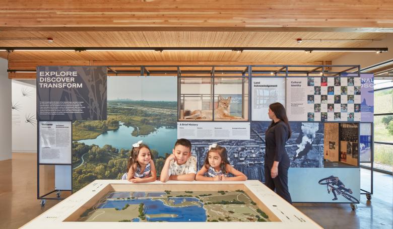The 9,300-square-foot facility is designed for education and park services, featuring a permanent exhibit about the site and region, classroom spaces, offices, a bike repair area, restrooms, and storage spaces. The building's materials reinforce its mission, with weathered steel cladding that recalls the site's industrial past, in contrast to exposed Nail Laminated Timber (NLT) which alludes to an environmentally responsive future. Two large rooftop light monitors clad in wood cantilever over the entrance, flooding the interior double-height exhibition area with daylight.