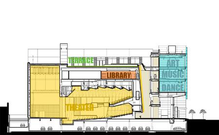 The challenge of designing a large school on a compact site in a dense, low-rise urban environment required careful attention to the vertical organization of the building. Numerous alternatives were explored. We sought to strategically highlight the arts-related spaces and to infuse interactive community spaces and impromptu performance areas throughout the building to create a memorable environment for arts education. This strategy also strengthened the opportunity to present these ideas outwardly, expressing the school’s curriculum and the symbolic importance of arts education on the building’s primary facade.