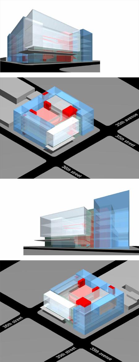 The site, a 200 foot square area, had to be transformed from a parking lot with a deserted WWII army barrack to accommodate the new school program of 147,000 square feet as well as parking for 100 cars. After considerable exploration, the solution became quite simple—build the new school on a structural platform of lower level parking with a five story building above. The design process explored revealing the arts related curriculum within the building along the major avenue facing the Museum of the Moving Image and the Kaufman Astoria Film Studios. The openness and transparency of the building’s primary façade along 35th avenue was intended to support the vision of a powerful presence for arts education in the neighborhood and the city. The arts related program revealed in the façade of the building was considered important both day and night.