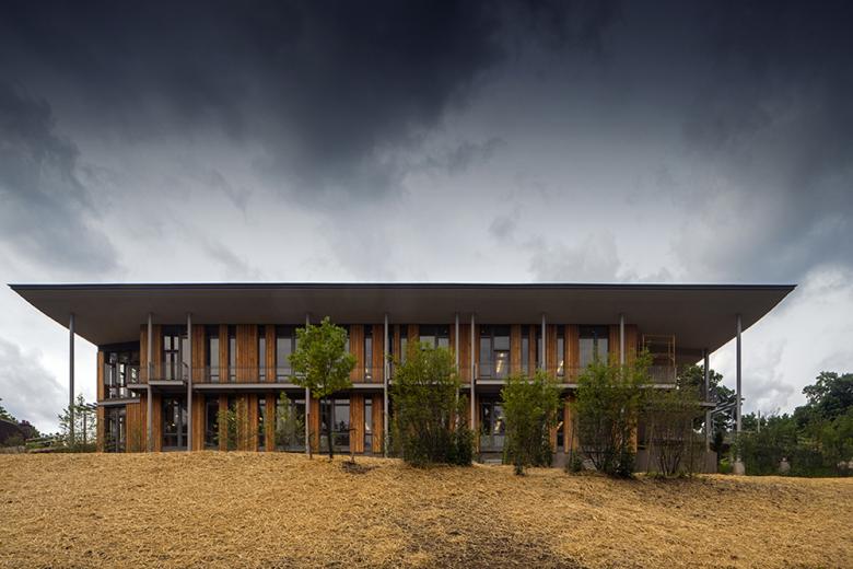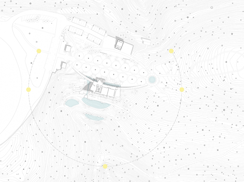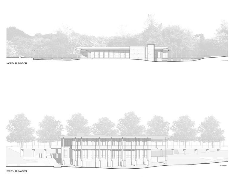 Visitors enter the building from raised bridges, giving the immediate effect of being elevated into the park. The south side of the building has circular steel columns placed at irregular intervals, mimicking the natural growth of trees within the dense woodlands surrounding the facility. Visitors can access the building’s south balcony, experiencing the park from the height of the tree canopy.