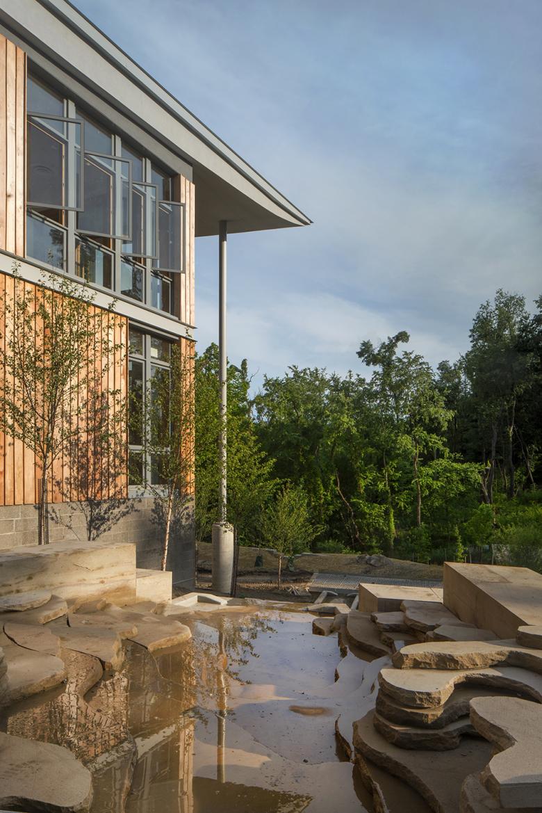 The project design and layout are heavily influenced by the site’s topography. A natural plateau in the middle of the site marks the area of formal landscaping between the historic gatehouses and the fountain. This plateau is one of the highest elevations in Frick Park, and near the point of origin for several watersheds. Along the south rim of the plateau, the Frick Environmental Center building is gently nestled into the hillside, designed with a simple sloped roof. During rain events, rainwater falls from the sloped roof of the Center in a dramatic, sheer curtain, called the Rain Veil, which is visible from both within and outside of the building. This falling water enters a river rock basin and is routed around the western corner of the building where it playfully makes its way down a hillside of stepped sandstone.