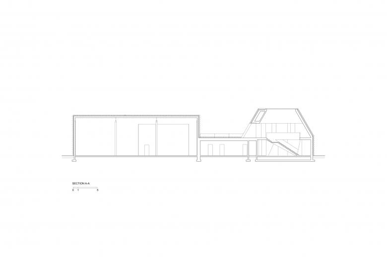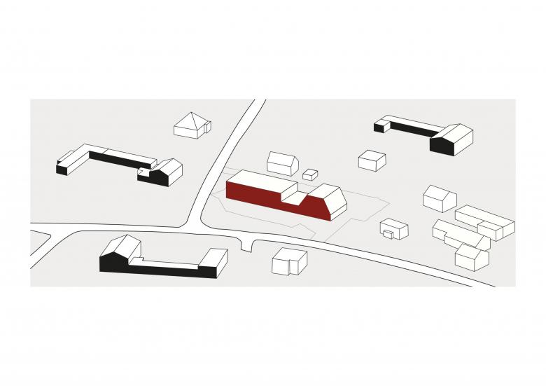 There used to be a rectangular industrial hall on the site, but the immediate surroundings are mostly residential houses with steep roofs, often connected to long, cubic outbuildings. This inspired the final form of our building.
