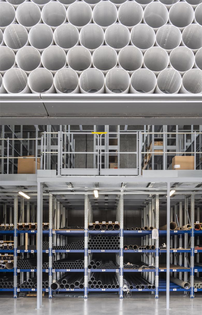 We wanted the office and warehouse parts to form a coherent whole, and for the entire building to look like a stack of pipes. It felt like the most logical solution—economical, and at the same time deeply rooted in the company’s identity.