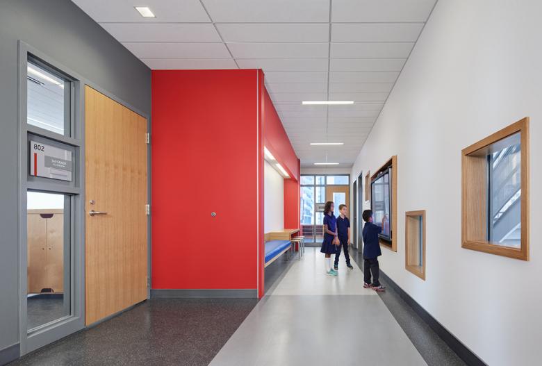 Due to its height, the school’s vertical circulation is achieved through two light filled stairwells and three elevators. Integration of glass at the stairwells provides students and staff with a frame of reference to the exterior and improves wayfinding as students move from floor to floor. A sun study confirmed that the positioning of the stairs at the north elevation, combined with the shading effects of surrounding buildings, would limit solar heat gain to these spaces.