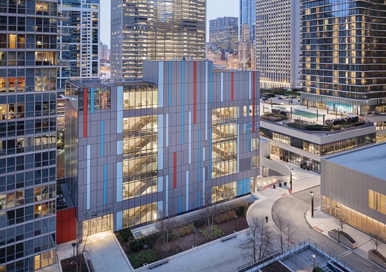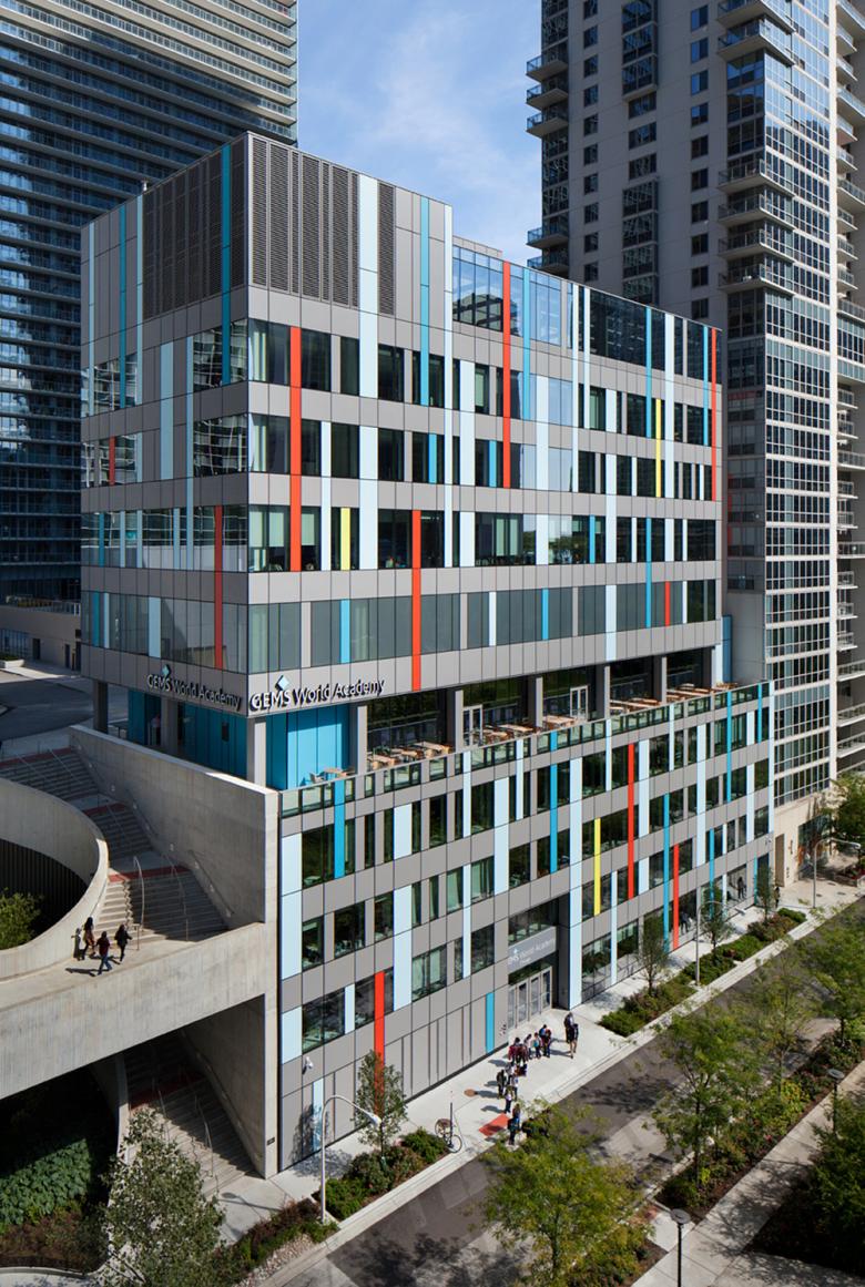 Chicago's Lakeshore East development consists primarily of high-rise residential towers oriented about a central green space just steps from Millennium Park and the Loop. At one corner of the park is the ten-story GEMS World Academy, the first of two planned school buildings designed by bKL Architecture for Dubai-based GEMS Education. The architects at bKL answered a few questions about the building, whose colorful facade makes the vertical campus a pleasing addition to the community.